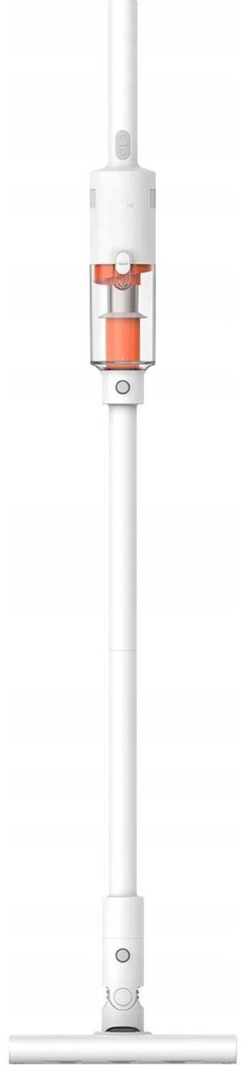 Вертикальный беспроводной пылесос Xiaomi Vacuum Cleaner P30 выполнен в компактном корпусе белого цвета с оранжевыми акцентами. Конструкция цельная, без разборной трубы, что делает устройство более устойчивым и удобным для быстрой уборки. Вес пылесоса составляет 1,46 кг, поэтому им комфортно пользоваться одной рукой и легко переносить между комнатами.