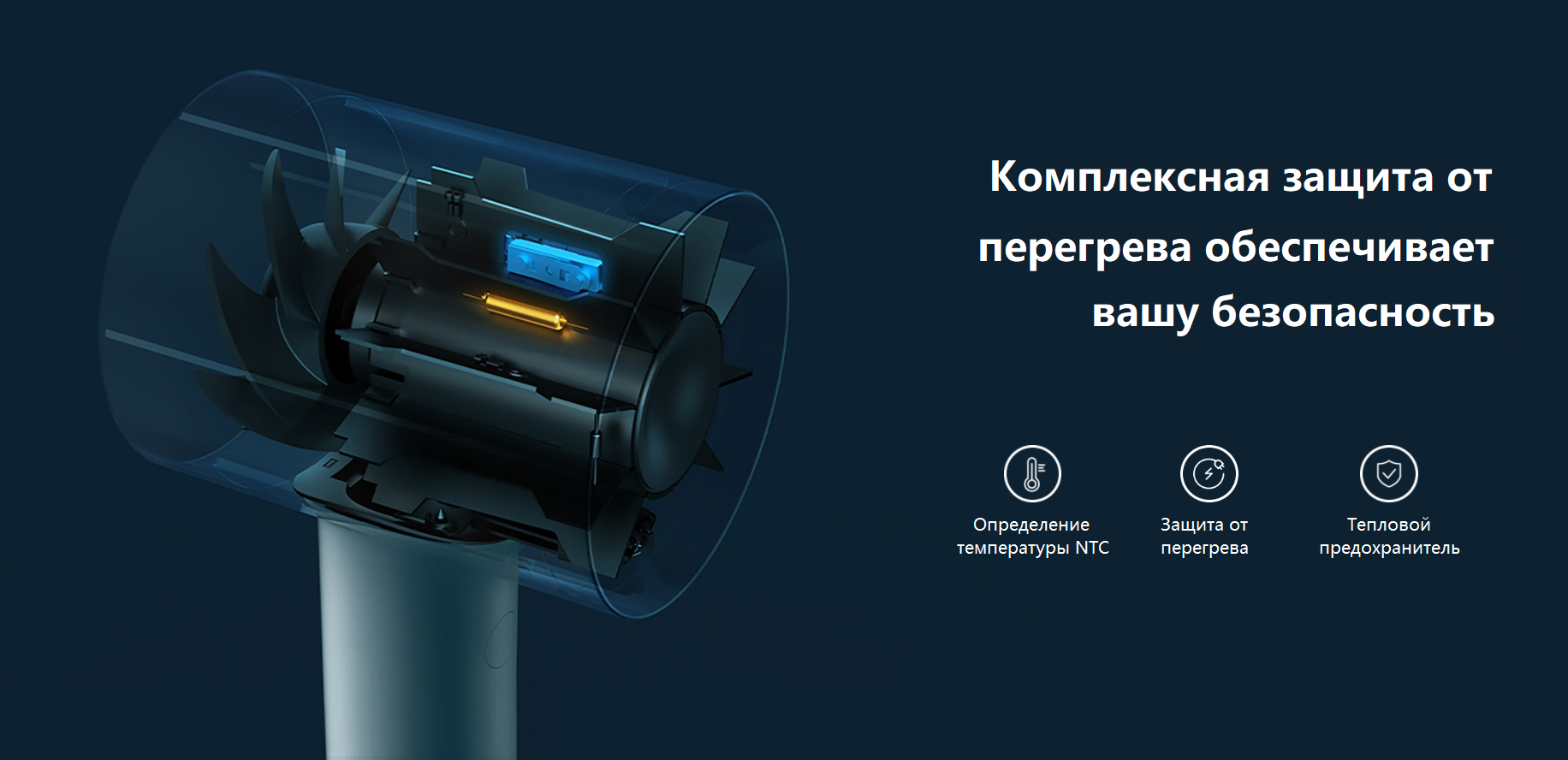 Когда NTC обнаруживает, что температура воздуха слишком высока, он прекращает нагрев; высокоточный модуль контроля температуры автоматически отключит питание в случае чрезмерно высоких температур; защита плавких предохранителей сработает, когда температура превысит контрольные значения для обеспечения безопасности.