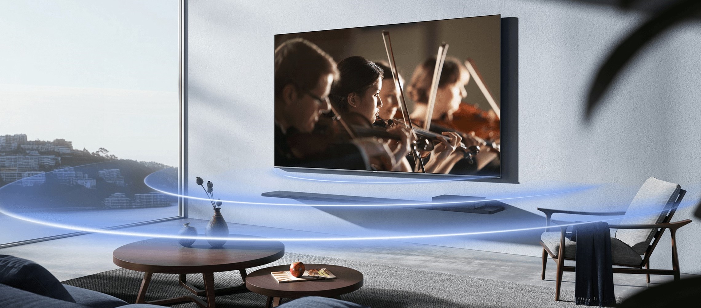 Телевизор оснащён встроенной аудиосистемой мощностью 30 Вт, поддерживающей технологии Dolby Audio и DTS:X, что обеспечивает объёмное и насыщенное звучание при просмотре фильмов и сериалов. Устройство воспроизводит мультимедиа с USB-накопителей и поддерживает популярные форматы видео, аудио и изображений, включая MPEG, H.264, H.265, MKV, FLAC, AAC и OGG.